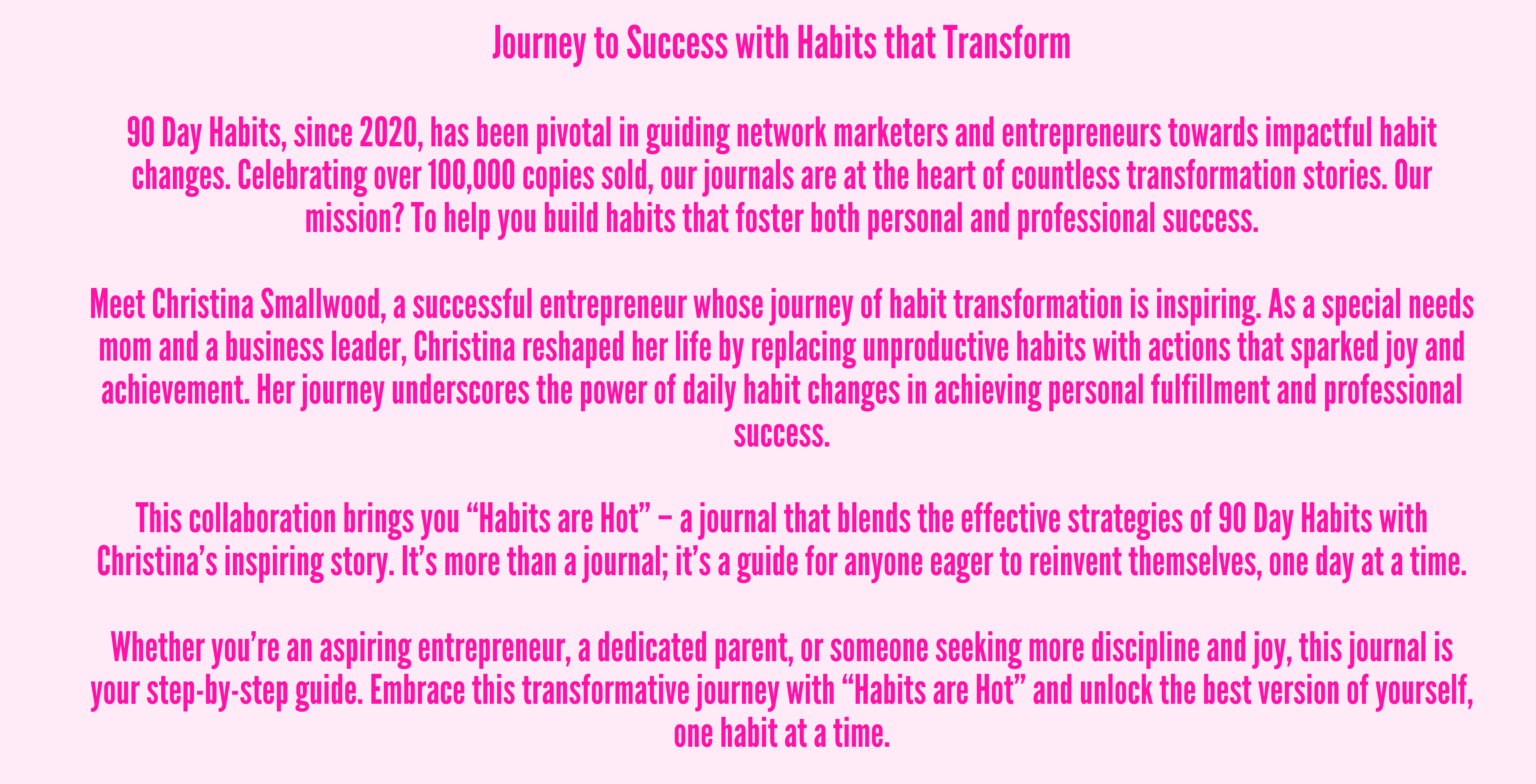 The Habits are Hot Journal makes it easy for you to start embodying the habits and mindset of your future self. It provides a structured framework to implement the actions and routines that lead to success!